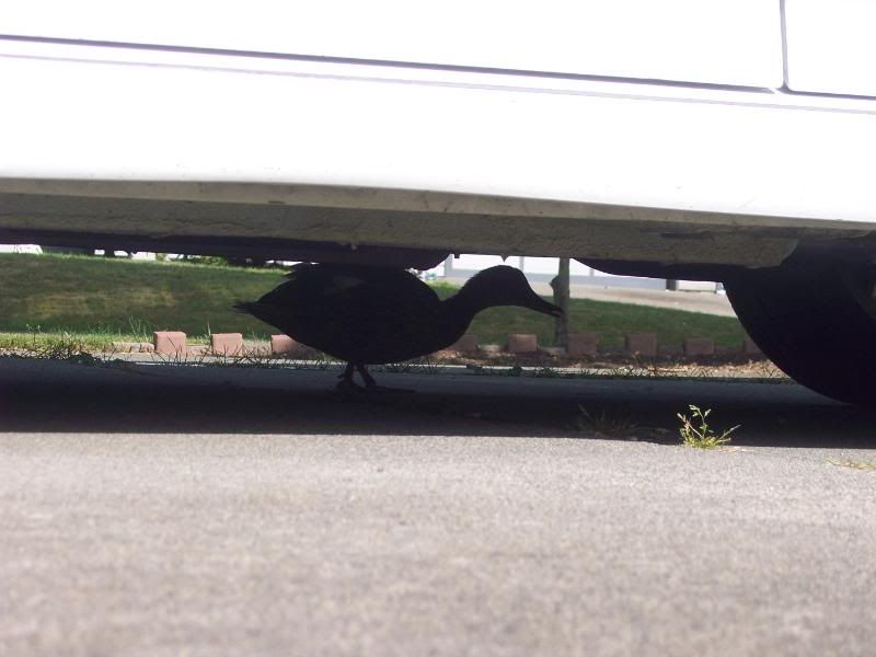 The duck hid under the car, then I had to chase him out. Then he got terrified and hid in my bushes. I left him there to calm down and that was the last I saw of him. Or her. It actually looked more like a female, what with the brown feathers and lack of a green head.