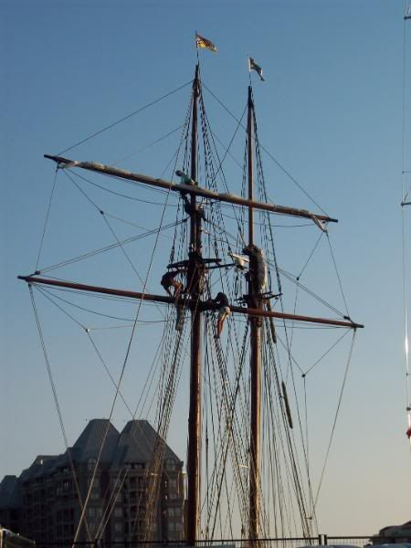 People watching the Ska Festival for free from the rigging of a ship in Victoria's harbour.